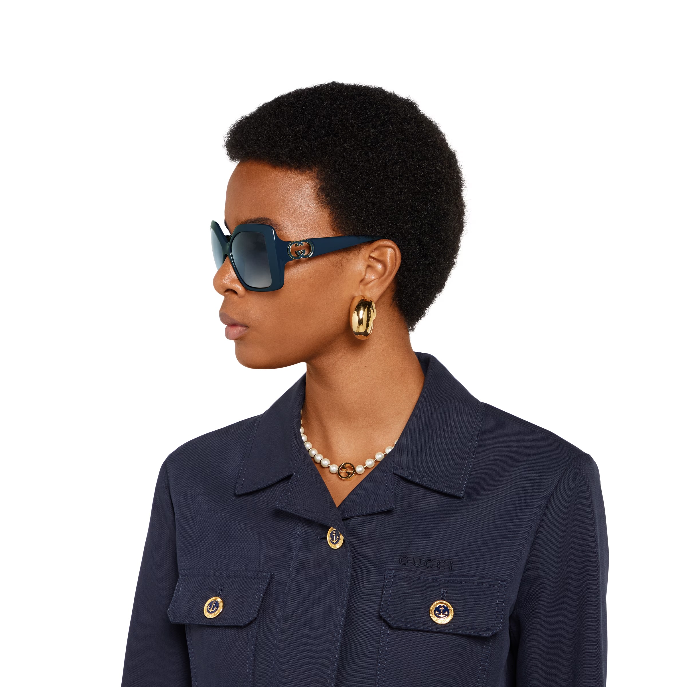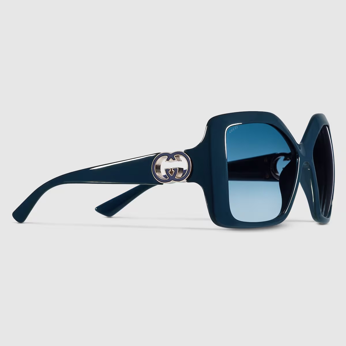 Acetate sunglasses with a sophisticated rectangular shape. The frame features thin rims and ultra-flat lenses that highlight the extreme lightness. The vertical Miu Miu logo adds its signature to the temples for a refined touch.