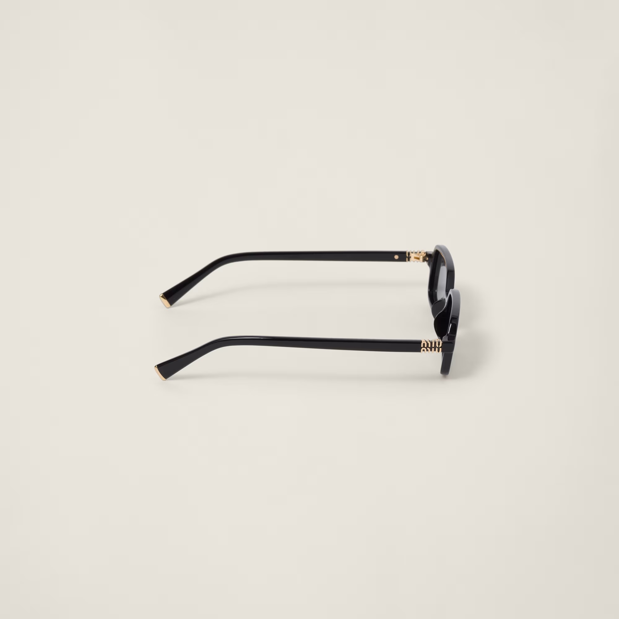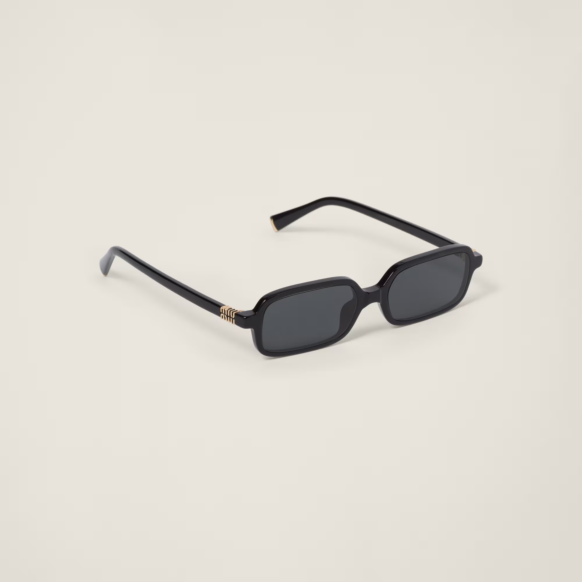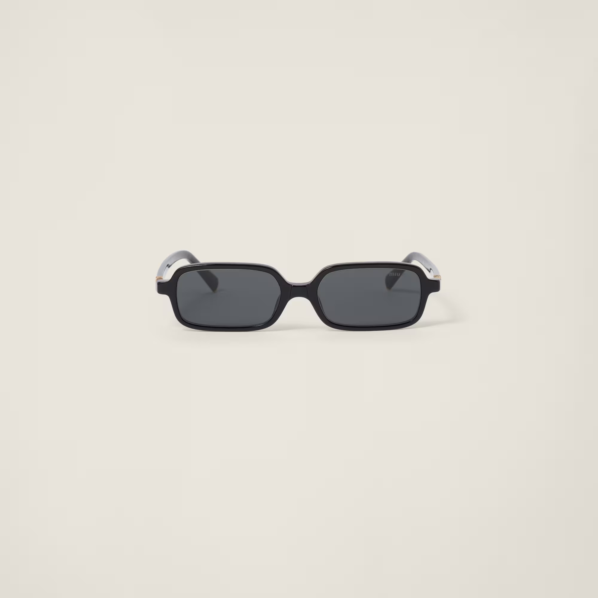 Acetate sunglasses with a sophisticated rectangular shape. The frame features thin rims and ultra-flat lenses that highlight the extreme lightness. The vertical Miu Miu logo adds its signature to the temples for a refined touch.